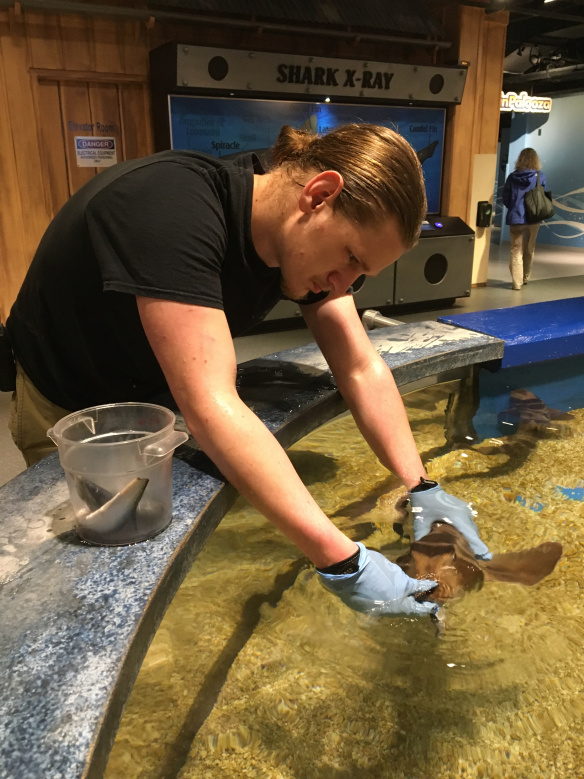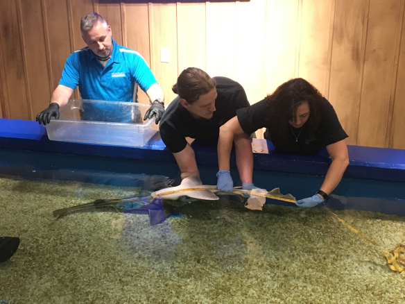 Una de mis partes favoritas como biólogo es observar cómo los animales que cuido crecen y muestran signos de mejor salud. Una forma que utilizo para medir el crecimiento de mis animales es registrar regularmente su peso y longitud. Aquí, otros dos biólogos, Matt y Jen, me ayudan a medir la longitud de Fuji. ¡Estoy muy feliz de ser parte de un equipo de biólogos tan solidario y servicial aquí en el acuario!