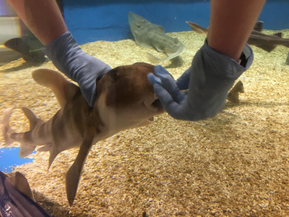 Fuji es uno de nuestros tiburones toro japoneses en Shark Central. Vino a nosotros desnutrido y no comió solo. Scott Brehob, el biólogo que se ocupó de los tiburones en Shark Central antes que yo, ideó un método para alimentarlo. Fuji ganó peso y mejoró su salud. Pude usar lo que Scott comenzó para que Fuji comiera alimentos sólidos con poca ayuda, ¡y estoy feliz de decir que está mejor que nunca!