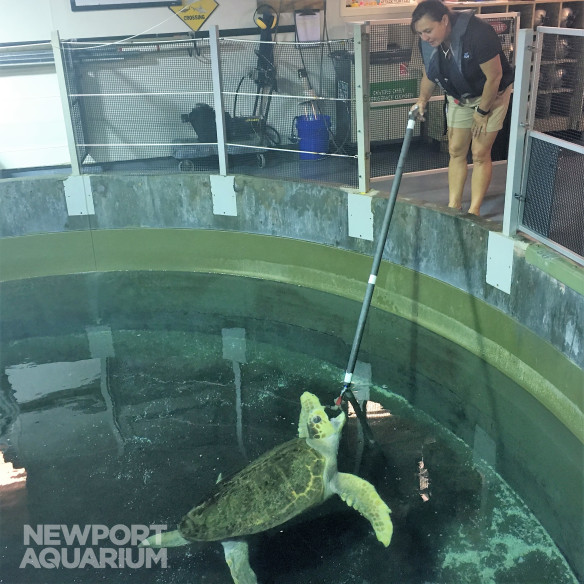 El biólogo senior Jen alimenta a Denver, nuestra tortuga boba adulta en su estación. Denver tiene aproximadamente 24 años y pesa alrededor de 205 libras. Sus comidas favoritas son el pescado, los calamares y el salmón, que come regularmente de 3 a 5 días a la semana.