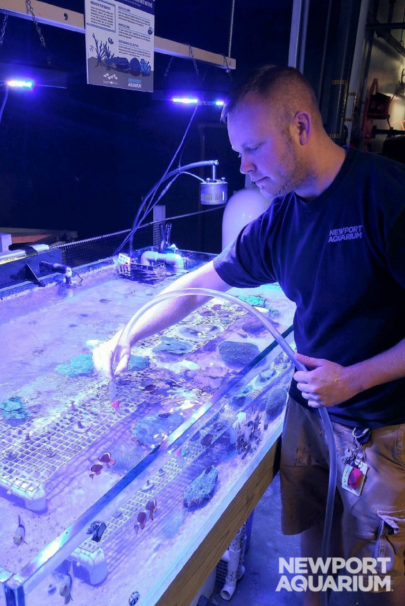 El biólogo Rob limpia nuestro tanque de reproducción de coral.