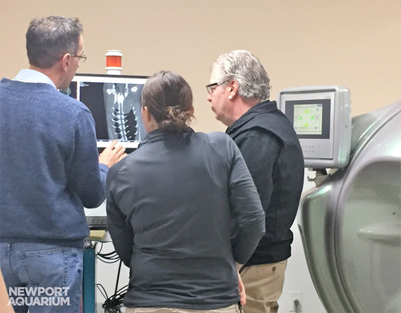 Nuestro equipo de veterinarios evalúa algunos escaneos de Victoria, el pingüino.